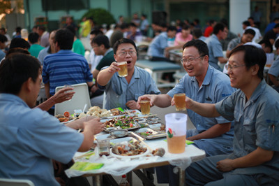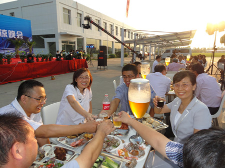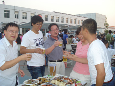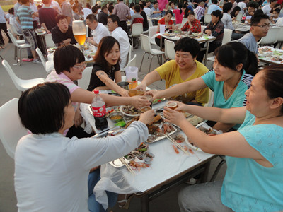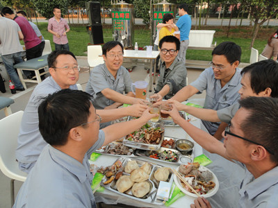 17:30分, “第四屆員工納涼晚會”正式開始。首先是員工聚餐。近400名員工,伴著歡快的樂曲聲,推杯換盞,大快朵頤。公司總經(jīng)理志賀進(jìn)、常務(wù)副總經(jīng)理王正軍等公司領(lǐng)導(dǎo)走入員工中,與員工們親切交談,敬酒祝愿,整個(gè)會場洋溢著一張張歡樂的笑臉。