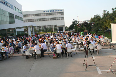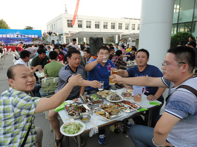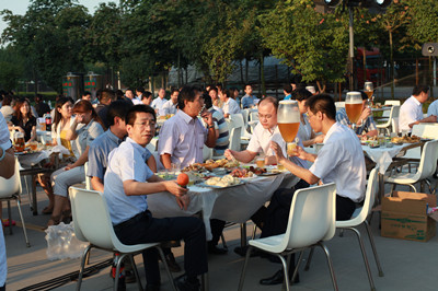 24日下午,公司辦公樓前,擺放著一排排桌椅,員工們從餐廳端著盛滿豐盛食物的餐盤,擺放在餐桌上。南面的舞臺上,工作人員在緊張的調(diào)試音響,兩只紅色的氫氣球飄揚(yáng)在空中,在蔚藍(lán)的天空映襯下,格外的鮮艷,為整個(gè)會場增添了喜慶的氣氛。